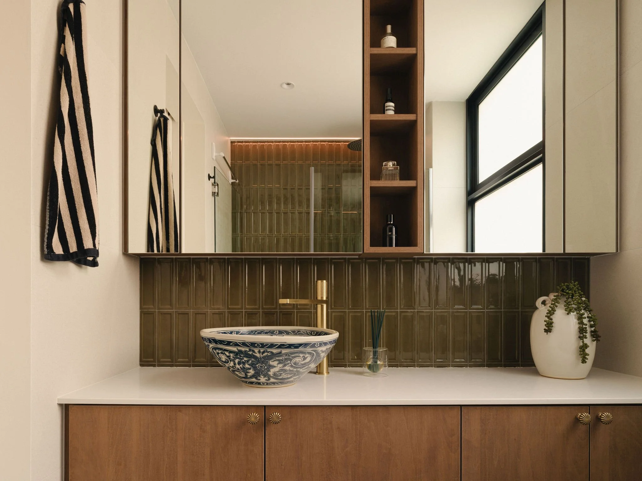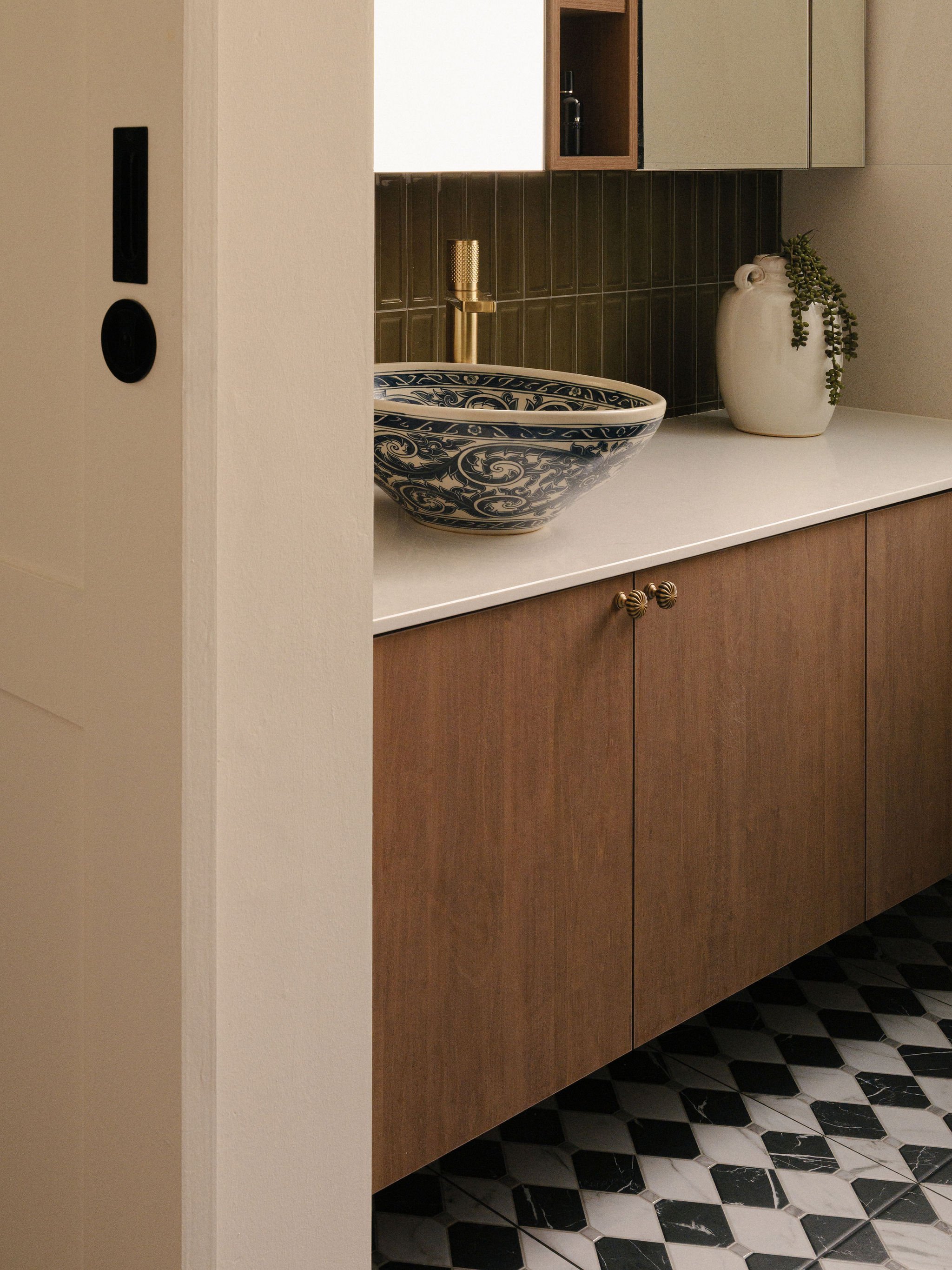 The baths are where colonial influences come alive in a fresh new way , patterned flooring meets warm timber tones and a hand-painted basin, balanced by glossy olive tiles and brass fittings. A nod to colonial charm reimagined for today.