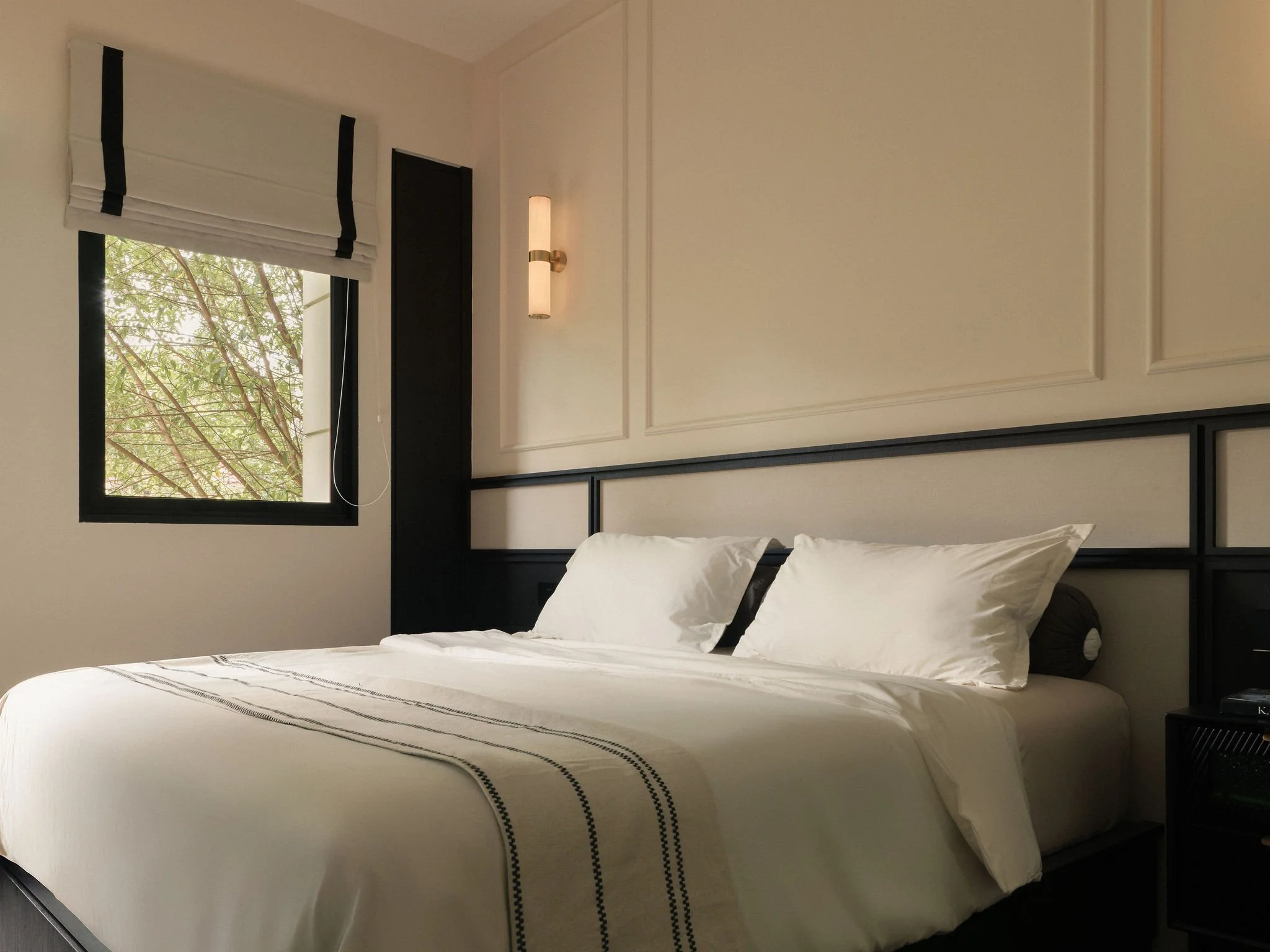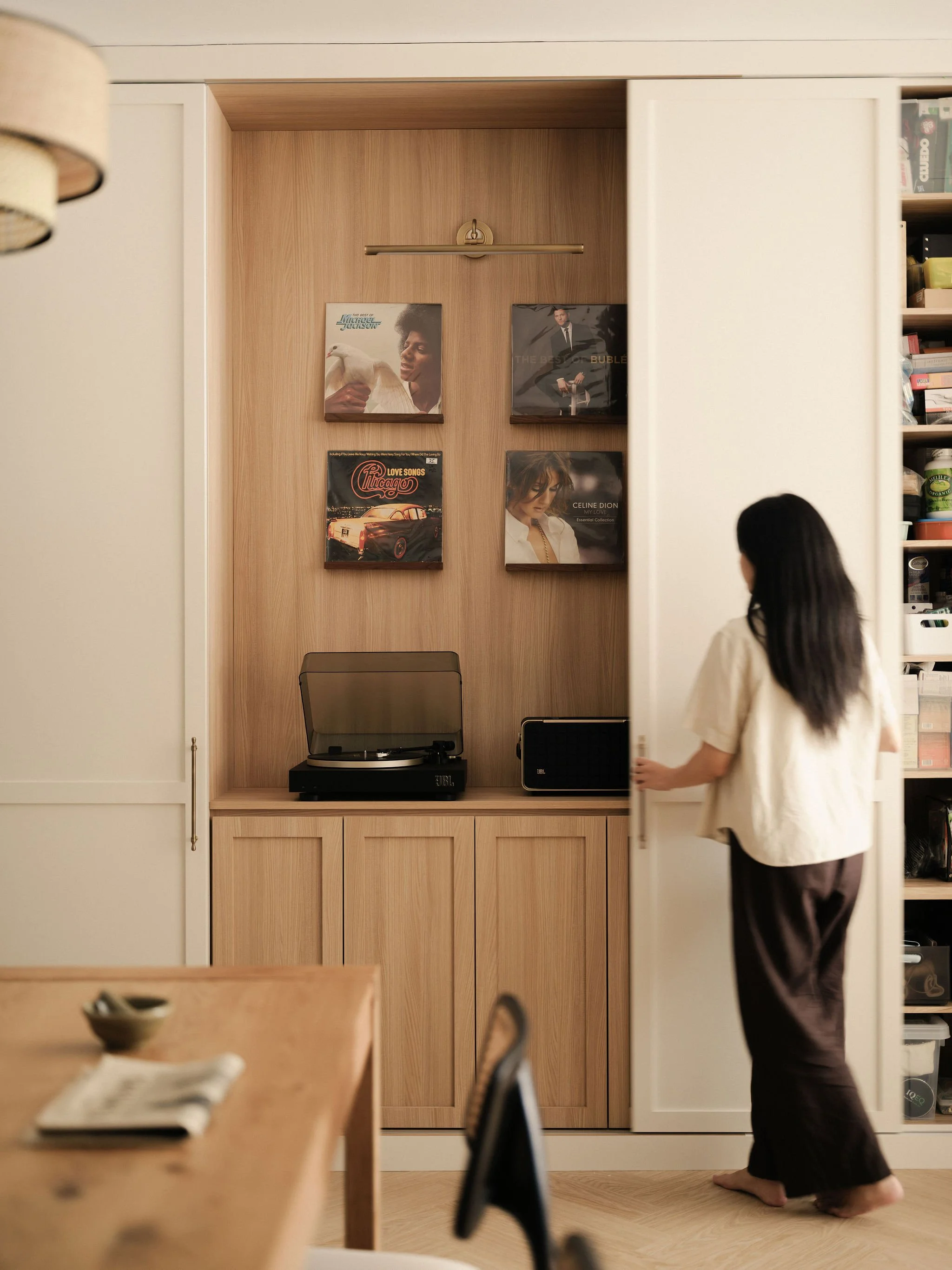 The living spaces are calm yet characterful, with soft neutral walls, tailored paneling, and black accents that frame the home with definition. Designed for duality, sliding doors hide the clutter while the display nooks open up to showcase a quiet alcove where music takes center stage. Timber shutters and timeless charm flow naturally through the home, creating a rhythm that feels both classic and contemporary.