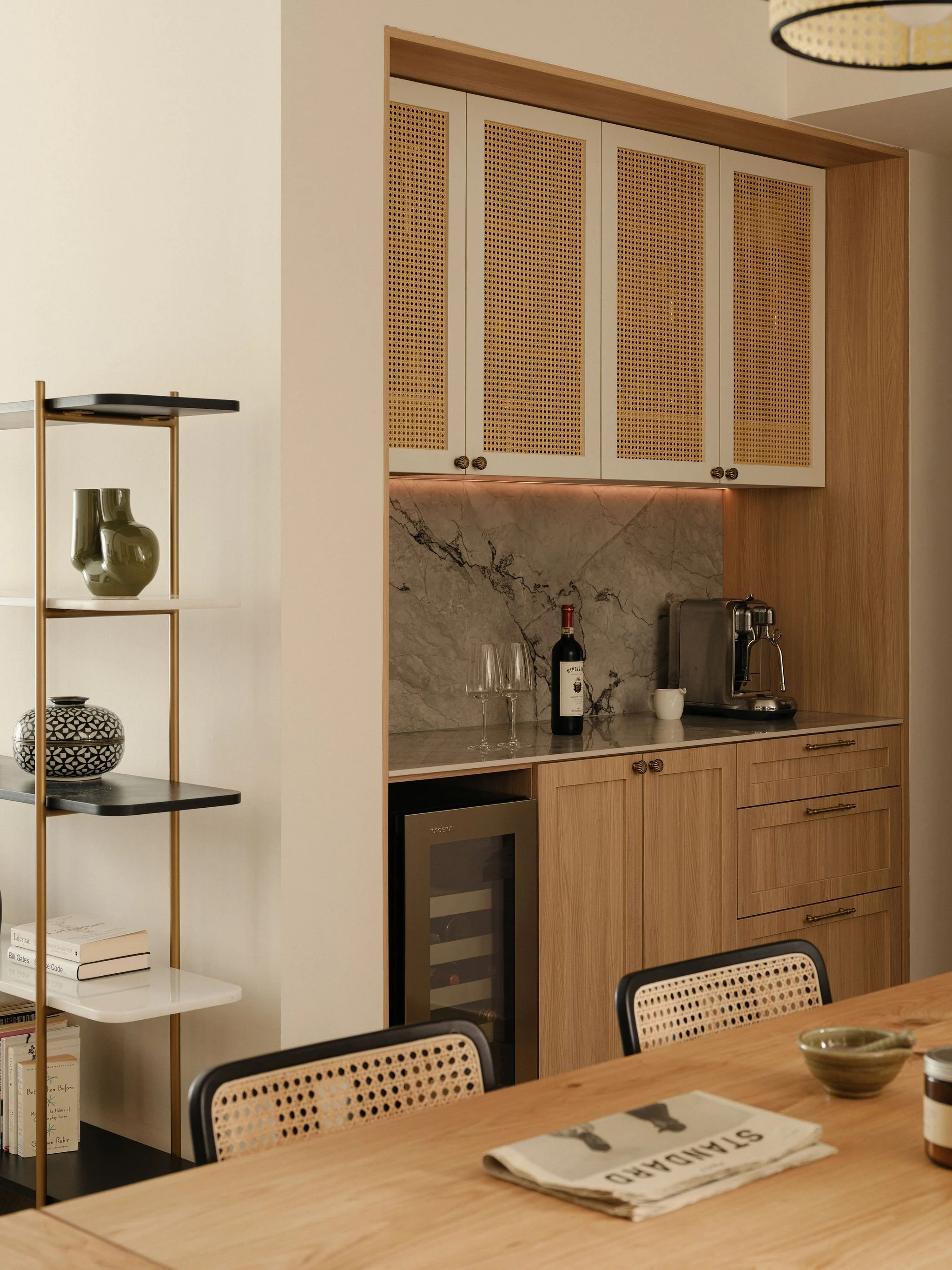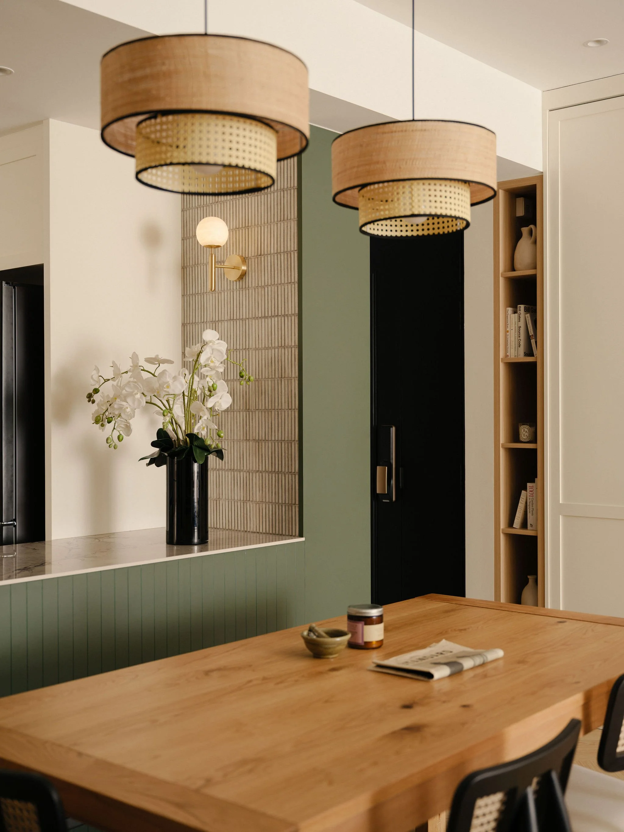 In the kitchen, deep green cabinetry grounds the space, balanced by creamy shaker fronts and patterned flooring that nods to heritage details. A bar counter clad in marble and fluted panels elevates daily rituals with a touch of understated elegance.